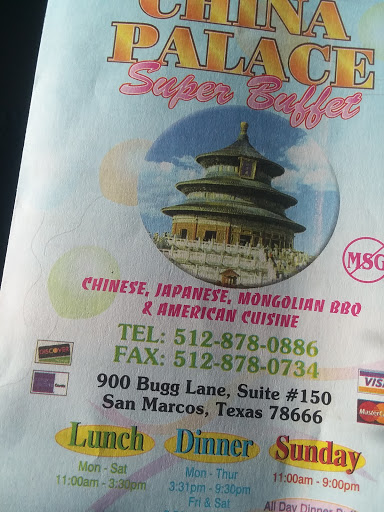 My son, grandson, and I ate lunch at China Palace for the first time on June 27. We were passing through San Marcos. Ive eaten at many Chinese buffets, however, the food at this place was fantastic! The various foods were very tasty, fresh and well flavored. I was also shocked by how inexpensive it was to eat at China Palace. When we return to this area, we will most definitely visit this restaurant again! I highly recommend this place.