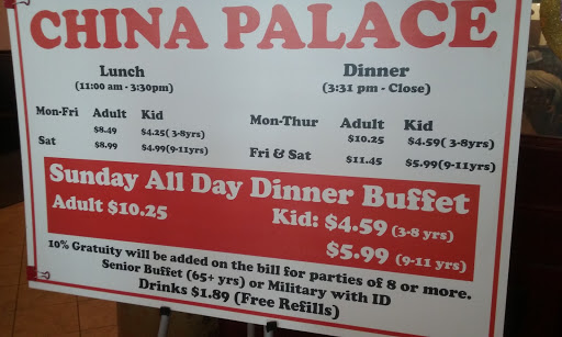 Awful. The only time our server glanced at us was when he went to seat us, and the food made me feel sick midway through my meal. That days sushi was dried fish over rice, coupled with crab rangoon that was--somehow--stretchy and tough near what was meant to be the crisp top. Forty bucks for this? Oh, wait, they charged me extra to come in on Friday for the dinner "service". Where we were served bland, unappetizing food that couldnt be described as fresh if we had come in hours ago. Where we were served by a staff that seemed too happy to do nothing but clean on a slow saturday night three hours before closing. Where we were served food borne illnesses. And then were served an equally abysmal check. Dont worry, China Palace! I wont come back in on a Friday if thats your idea of service. Or any other day that ends in y. If you want to have a good dining experience, Id suggest you do the same.