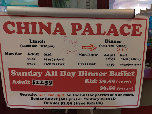 This was our first and last visit to China Palace Buffet. The ambience and service leave a lot to be desired. Most reputable Chinese Restaurants play oriental music; not this one. I read that the restaurant had been redecorated, good thing, I would have hated to see it before. All the chairs needed upholstering...badly used fabric. Restaurant had very sterile (not to mean very clean) look; once more no ambience.