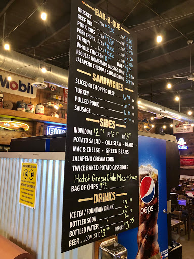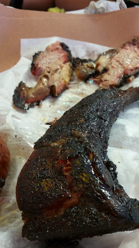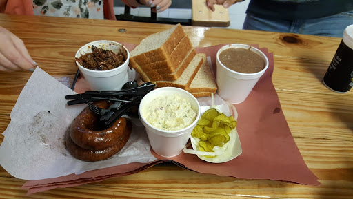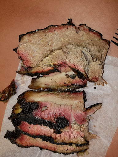 Their brisket is among the best in Texas. You order by the pound and can specify whether you want meat from the fattier or the leaner part of the brisket -- or not specify. This is classic smoked barbecue. Ive eaten in all of the "Best Five BBQ" places in Texas, several times. This is one the par with these. They also have BBQ pork chops, links, chicken and maybe something else. The links are not as fatty as some, have a characteristic flavoring which you may or may not be thrilled about. I keep wanting to try the chicken or pork chops but the brisket is just so darn good, I cant turn it down. Their beans are the best, with the most BBQ included, and LOTS of black pepper, and I think they are great. When I Say Grace before eating, but when Im here, I dont tell The Lord where Im eating -- for fear Hell snatch them up to heaven to cook for Him. Dont let on, or were liable to lose them!