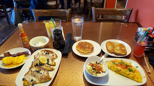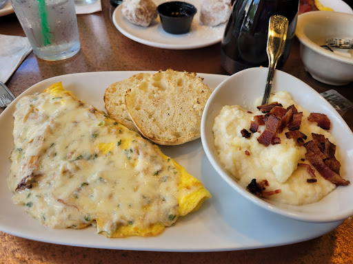 Another Broken Egg Cafe may at first appear as another (excuse the pun) breakfast/brunch joint in the vein of Egg & I, but ultimately its quite different. They even have their own branded pepper sauce too (though thats where the similarities end). The good: spacious, shorter waits, better parking. The menu is noticeably on the southern/gulf side of things with the seafood and andouille offerings, along with grits. What it lacks in choice and variety of coffees, juices and bread (no toasts, only english muffin) it makes up in spiked beverages like coffee with Kahlua/Baileys/Amaretto or mimosas/bellinis for those who like to get their buzz on during brunch. The bad: really poor service. Lukewarm, slow (please dont explain delays and absence by blaming unexpectedly large groups that require too much work and attention - thats not professional), too impersonal and hardly anyone smiles. Spruce up the service and Ill be back more often.