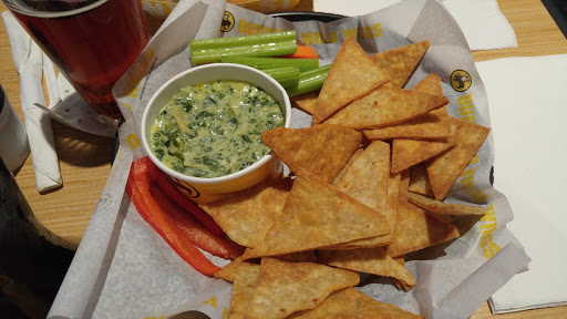 My visit was at about 9:30pm on a Tuesday and the place was thrashed. The floor had mashed french fries and litter all over, i had some weird sticky stuff at my place at the table that i had to clean off, our server mixed up the drinks on our separated tickets and she forgot about the garlic bread that came with my ceasar salad, there were people screaming at the baseball game on TV (I understand that this is basically a sports bar but people screaming is a bit much), and the place was just cramped in general. I visited this establishment because I had some foreign colleagues who wanted to but I dont think any of us would visit again by choice. I rarely leave non-positive reviews but this place felt more like a poorly managed Chuck-E-Cheese than a restaurant. Overall, it was disappointing because I have been to different Buffalo Wild Wings franchises and all of the other ones were great.
