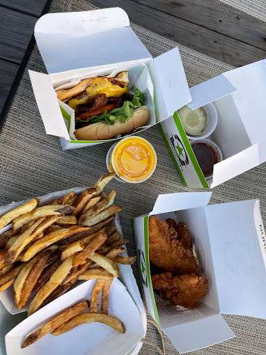 Place looks new. Great esthetics with a good concept. However, the food was not as good. I got the lettuce cheese and bacon burger with large fries. My burger was way over cooked. It was super well done, almost burnt. They dont give u a choice on how u want it cooked. My French fries were left in the fryer way too long. My fries were way too crunchy with a taste of old frying oil. My order came in a servingvtray with no platesvor silverware. I had to use a napkin as a player and spread my mayo with a frenchfry. Its a nice new place with a good atmosphere. However, the food might have tasted better if it wasnt over cooked. Id say stick to Whataburger.