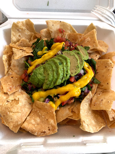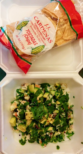 Fantastic. Ceviche with fresh ingredients. Shrimp or mahi mahi or a combination of each. Add four toppings at no extra charge. Choose from savory, sweet and spicy. Each additional topping for $.69. Tortilla chips and sodas are also available. Two tables for two indoors with extra seating outside. Most guests opted for take-out. Glad to have found a rare healthy option in the area.