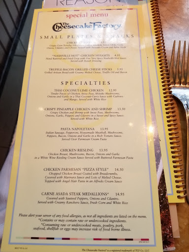 I have been coming to this location since 2007. This is a favorite date spot which is a rare opportunity four kids later. Todays visit was awful--the lowest of service AND food qualiry! We waited forever for our waters to come to the table. Then told bread was on its way which again we waited --these minor issues werent the problem tbeybjust added to a miserable experience from beginning and end. My husband ordered his favorite burger which came cold to table. I opted for my 2nd favorite dish Bang Bang Chicken and Shrimp over my favorite Salad!! I have a few bites as I look down at a small piece of chicken I think that looks pink but thought its probably the lighting C.F. never messes up my favoritr dis!. A few more bites later as I am chewing it is apparent by the rubbery texture I just consumed a raw protein!! Immediately I spit it out last thing I need is to be sick with 4 little kids by my side over the next 24 hours!! We wait for our waiter cant find him. I walk up front find manager. She offered a cheesecake or remake as I disclosed to her at this point I have completely lost my appetite we just want our check and box for husbands meal. We waited, we waited, for our waiter/manager for a box for a menu etc...all I just wanted was to leave. We get our bill...yep food is still on there but it took so long to just get to even finalizing our bill we leave our money and go. I had already been sick in bathroom while we waited for boxrs and check which Im sure was psychosomatic. Now I write this review at 1am because I have been sick since 11pm ](we are at 2pm)....Thanks for charging us C.F. for wasting our time and our money as my husband boxed up his meal for is to pay a sitter for the nonmeal we had!! I even showed the manager the raw pink chicken this is unacceptable in such a well known establishment. If I was pregnant with my high risk twins and this happened it could be so fatal--for C.F. raw poultry is unacceptable!! Zero tolerance you dont mess with food safety! I am a decent homecook even I understand the necessity of proper food handling. As a former restaurant worker the right thing to have done was comp entire check especially when remake and free cheesecake turned customer green after eating pink poultry THEN offer a certificate to return in the future. Silver lining I wont be wanting to return here for a very very long time I am so grossed out that I had raw chicken in my mouth!!
