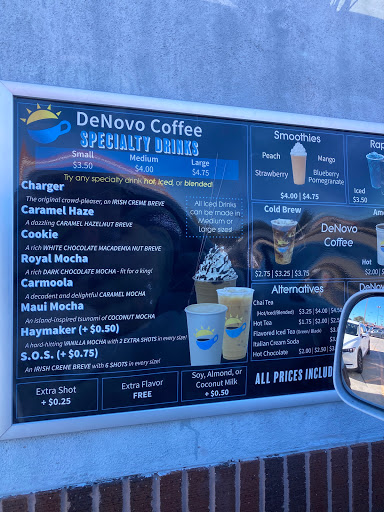 DeNovo hit the spot not once, but twice! That means BONUS points for you, DeNovo! My fiancé and I tried DeNovos coffee recently and we are so glad we did! DeNovos unique architectural design makes it stand out without screaming for attention, which also adds a friendly, warm vibe to it. It is a minimalistic coffee shop with extraordinary drinks. After deciding on what we wanted on the easy to read menu, we approached the window only to find two awesome baristas! They were kind, energetic and very friendly! I ordered the Carmoola blended drink (which is like a frappuccino) with whip cream and my fiancé got the Royal Mocha blended drink without whip cream. I usually dont get whip cream but Im glad I did this time. It was fluffy and rich with the perfect hint of sweetness to it. After seeing and trying my drink, my fiancé immediately said, "Man, I wish I had gotten the whip cream too!" Lesson: dont skimp out the whip cream! ;) Both of our drinks were top notch. I could taste the silky, creaminess of the dark chocolate and caramel flavors with every sip. Simply delicious! Wait...theres more! DeNovos philosophy is, "every day is a new day". They have an inspiring logo of a cup filled with coffee with the sun shinning out of the cup. This was actually one of my favorite aspects of DeNovo. A cup of coffee is what most people begin or end their day with. "Every day is a new a day" with a cup of awesome coffee is a wonderful way to begin or end a days journey. It is often forgotten that each day is an opportunity to discover something new, to lend a helping hand, to do something different, or to simply start fresh. If youre having a bad day, this is the perfect place to go to lift your spirit! I cant wait to visit DeNovo again! P.S. I think Austin, TX would really enjoy a taste of your drinks! :)