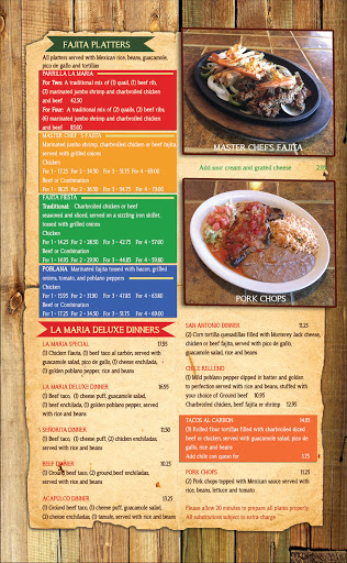 The food was bland. I had the master chefs fajitas. It came with 6 shrimp that were butterflied with the shells still on them and even though they looked well seasoned they tasted bland. The meat was tough and chewy and also could have used any amount of seasoning. It didnt taste like there was any. The basics of the meal, the rice and beans, were the blandest I have tasted in decades since a friend from New York tried to demonstrate that they knew Mexican food. They didnt and La Maria doesnt either.