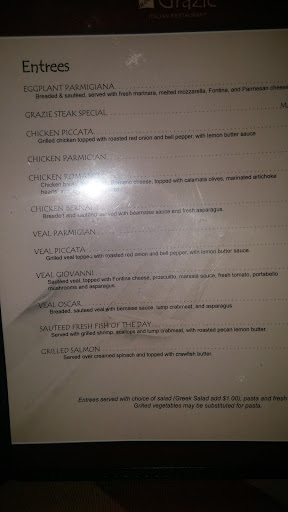 Food is horrific. The fettuccine Alfredo literally had no seasoning & chicken was dried up. Veal tasted like rubber & wine list was laughable. Oh and learn how to spell thank you in Italian. Its Grazie.