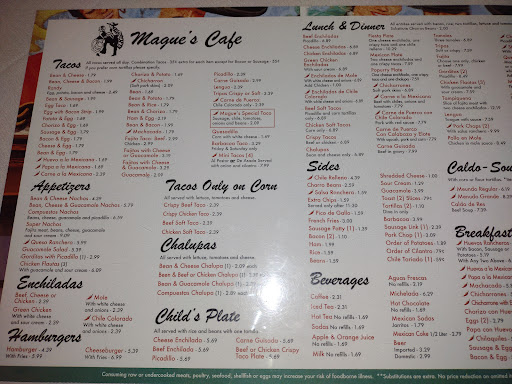 Great quality and taste; clean kitchen and restrooms; good service... Long: I dont understand the negative reviews. Was driving from New Braunfels, TX to El Paso, TX and we were hungry and not in the mood for typical fast food at around 1pm on Presidents Day. Saw lots of cars and stopped. One waitress was not very friendly, but the owners daughter was the one who helped us. The service was great. The tacos and gorditas were outstanding. Crunchy and flaky at the same time. Fresh ingredients. Looked in the kitchen then visited the restroom. Both were clean and organized. Based on this one visit, I recommend Magues Cafe.