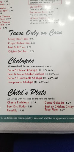 Very disappointed. Ate here about a month ago and the food was really good. Today not so much. Limited choices for breakfast, settled for tacos and a chalupa. Chorizo&Egg with no chorizo and the eggs t tasted burnt. Piccadillo was good but not grand. Carne Guisada was too much tomato or ketchup (at least thats what it tasted like). Bean& Cheese chalupa was the best part, but then again its hard to screw them up.