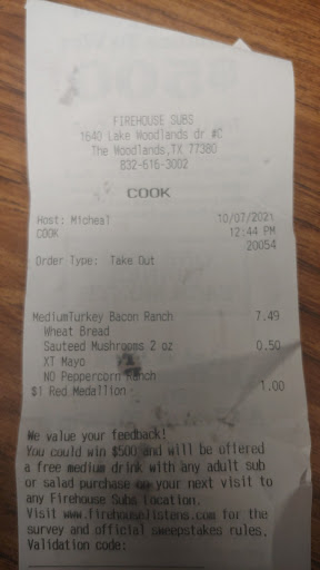Firehouse is general is great, unfortunately the lobby was empty and waited 15-20 minutes for a sub. Then when I received the sub was made incorrectly. (good thing Im not allergic to mushrooms) Took it to the cashier who then tried to blame the error on me.. Wouldnt recommend this location.