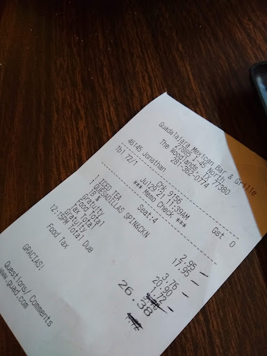 We sat for 10 minutes. Nobody said "hello". Finally, about 5 minutes later, somebody came by to take our drink order -- we had eaten most of the nachos and were dying of first. Five minutes later, he still had not arrived with the drinks, so we began to leave. The managers proposed solution was to allow us to sit somewhere else for a different waiter. THATS NUTS! She should have at least taken our order right then and there, made sure we had drinks immediately, and expedited our food order. We left, went to Papasitas. We were greeted within 3 minutes after we sat down. We had our drinks within 5 minutes and refills less than a minute later. (We were VERY thirsty by now). Our order arrived about 7 minutes later. Good buy, Guadalajara!