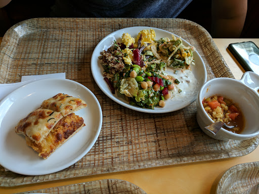 Decent choice of salads. Horrible watered down dressings lacking flavor. The only thing thats worth getting is the broccoli cheese soup and vanilla soft serve ice cream. The Italian melted cheese breads are ok too. ButDont expect to find much or any meat in their chicken soups or tuna in their tuna salad. Not much nutrition over all with so much carbs. Wouldnt be too bad if it didnt advertise itself as healthy food, which it is not. Oh and by the way only one choice of tomatoes, grape tomatoes and they were hardly sweet.