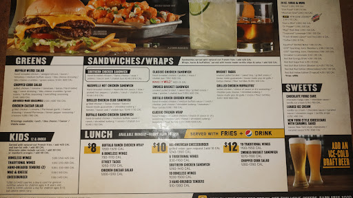 Best wings in town. If you like it hot order your wings bone in extra crispy with the mango habanero sauce then dusted with desert heat dry seasoning. Make sure to order the ranch and plenty of cold Corona to help cool down the heat! Appetizers here are really good and wing sauces are mostly amazing. Mild, medium and hot are all good choices for Buffalo sauce, although the medium seems to be the most balanced. Thai Curry is good if you like salty asian sauces - these are better after several beers. Spicy BBQ is surprisingly good and not too sugary. All around excellent food, great service, really cold beer, and most importantly great Buffalo Wings.