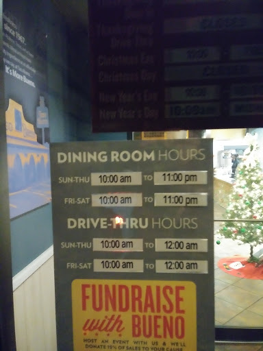 always great and clean not seen too much if any occupiers assaulting me with contaminated food or improperly maintained beverage dispenser(bleeach and soap properly flushed ) and condiments always pretty fresh but need more japs in fresh pico for my taste but will eat every meal there if could, it could be hotter though i am probly one of the first 100 people to eat at the first bueno as a child in abilene texas at orig location all items a dime and had taco burgers! great 35 plus maybe 40 yr consistency