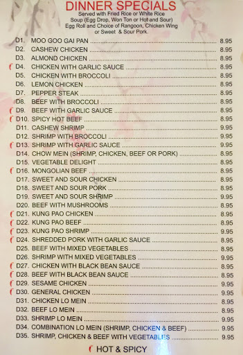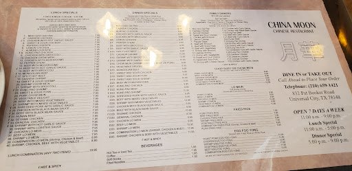 Ive only eaten at China Moon one time so far. I was driving down the street looking for somewhere to eat and just decided to give it a try. The thing that impressed me was the size, variety and price of the combination plates. On my visit I had the general chicken combo, which comes with fried rice and eggroll or soup for $5.50. The food had great flavor, the service was excellent, and the combination specials are available all day every day. Theres not many restaurants you can go to and get a whole meal with a drink for $8. Those are really fast food prices these days. I plan on returning again, to try some more of their items. If your looking for a hot lunch or dinner that wont break the bank this is a great place to eat.