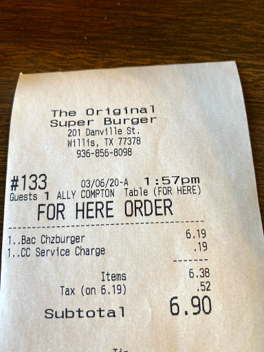 One of my 2 favorite burger places. The super sauce is my absolute favorite. The fried zucchini is good too. But hands down one of best burger places youll go to. There are a few great burger places I go to and super burger Willis is one of them. Later hours a few days a week would be good but it just makes it that more special when you get to go.
