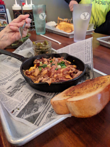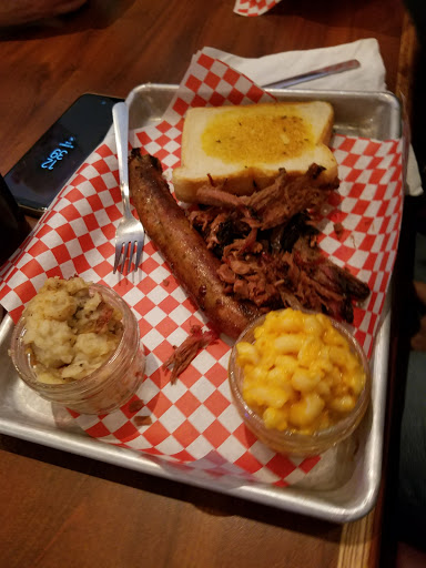 There was a lot of really good and a lot of really bad about my experience here tonight and so I wanted to write it while it was all fresh. As soon as I walked into the restaurant, I noticed how loud the live music was. It was a nice touch to have a live band there for a Saturday night, and the band was really good, but the volume was turned up so high that it was painful. My ears are still aching two hours later from it. Unfortunately, we were put at a table right by the live band. We couldnt talk to each other over the music and my ears and head were starting to hurt terribly. Our server, Tevis, was awesome. He gave some great recommendations about the food and was friendly. For the appetizers we got the cheese fries and hog heaven with brisket (Tevis recommended the brisket over pulled pork and I have to second that opinion). The fries were served with some of the best spicy ranch Ive ever had. We asked a worker if it would be possible to turn down the music because, again, it was so loud it was painful and we couldnt talk to each other while they were playing. The worker explained to us that the band had been asked multiple times to turn it down and they didnt want to. It had previously been taken to the owner and the owner didnt want it turned down because it added to the vibe. Let me repeat that: THE OWNER THINKS THAT MUSIC BEING SO LOUD THAT THE CUSTOMERS EARS ACHE FOR HOURS AFTER LEAVING ADDS TO THE VIBE OF A RESTAURANT. The next time Tevis came by, we asked him if there were any other open tables because the music was so ridiculously loud. Tevis was totally understanding and told us a table in the back was being cleared and we could move there as soon as it was finished. The back table was definitely better music wise but the decorations were hella weird. It was wedding pictures, which could be a really cute idea if it wasnt all of the exact same wedding. I think that could have been such an awesome idea if they were vintage pictures or pictures of all the workers or even just random pictures of weddings. Instead, there were like eight pictures of the exact same couple and it just felt... strange. It felt like I was supposed to know who they were, but I really, really didnt. It was distracting. I ordered the mac and cheese with the sides of the cobette and the baked potato. The mac and cheese was creamy and filling. The cobette and garlic toast were incredible and super buttery. The baked potato was nothing special. We also got some dessert. The banana bread pudding was disappointing, because it was banana pudding with vanilla wafers in it. I was expecting... banana flavored bread pudding. We also tried the deep fried pecan pie which was very rich and very delicious. The live band came by to apologize to us for the music being too loud and let us know that after we moved they turned it down a little. They mentioned that the table we had been seated at always has a hard time when theres live music there because of the acoustics. I appreciated the band coming to talk to us, but it made me even more frustrated because if that table is a known problem, it shouldnt be used if theres live music there. All in all, the food was decent to excellent depending on what was ordered. Tevis was super helpful. The owner clearly doesnt respect the customers. I think next time Im craving BBQ Ill be taking my business somewhere that my well being is taken into consideration.