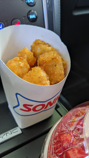 Food was fine, my complaint is with the eating area that is offered inside Sonic. Most of the tables looked like they were not wiped off, there was garbage on one of the tables as well. While eating an employee came out and took their break, turning on the TV and picking shows that were not appropriate for my 2 and 4 year old to be watching. Plus the bathrooms were not very clean and the toilet paper was almost gone. It was the nastiest bathroom I have ever been in that was provided at a place like this.