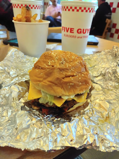 I consider myself a burger connoisseur. It is my favorite food and I have eaten a lot of burgers. This was my first 5 Guys visit. 5 Guys makes a pretty big burger. I like my choices of toppings --that is pretty cool. The burger is pricey, but acceptable, considering what you get. The bun was sorta like a big mac bun --disintegrated in my hands as I ate. A more substantial bun would improve the burger. The meat and other ingredients were excellent and very fresh. I ordered french fries. They were very good and the portion was good as well. I like the unique touch of having in-the-shell peanuts available for free. Overall, I spent $8.18 for a cheeseburger and fries, w/o a drink. The price will stop me from being a regular, but I will be back once in a while.