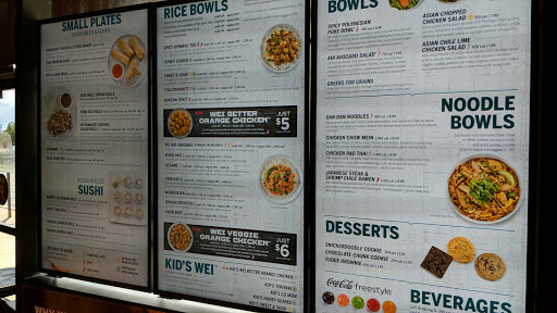 Food service is average. Sometimes its prepared well sometimes its burnt. This location is always dirty. The service station where you get drinks and silverware is always sticky, missing napkins or forks, out of ice or missing a beverage (tea twice, coke once). Numerous times theyve been out of items on the menu. The food is served messy, sauce on the sides of the bowls and plates, wiped down tables are always tacky with food particles on them. The floor is always sticky, particulaly around the service/beverage station. I believe the staff is poorly trained, many have trouble answering direct questions about the menu or resolving issues. If it werent for the fact that the next closest Pei Wei was 40 miles Id never come here