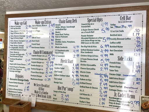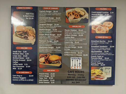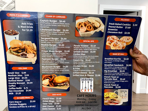 OVERVIEW Overall it was a great experience. Serving Time is like a best kept secret. The food is filling and delicious. I would recommend trying them. LOCATION It can easily be missed as it is in front of the prison. If you have a phobia of prisons or immates you may want to steer clear, and have a buddy bring you your meal, if you have additional fears, you may want to seek professional help. PRICE The price was reasonable, comparable to most fast food restaurants. PRODUCT/SERVICE The food was delicious. I ordered the Parole Violater which was a chicken cordon bleu with onion rings on a sandwich. I did also add a peanut butter bar. Id say that peanut butter bar was probably one of the best Ive had. Most of the time theyre pretty quick to serve the food. EMPLOYEES The employees are friendly, and I guess they would need to be in order to work in the cafeteria.