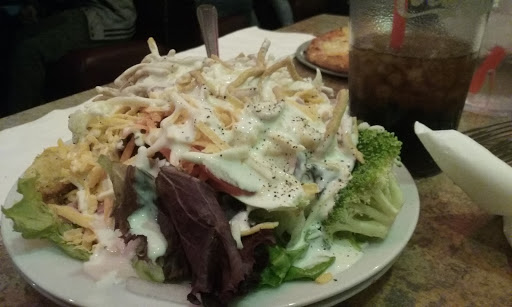 I am very shocked that I am giving a 5 star review to this place, I never give 5 stars. Service was great- our waitress was friendly enough and I always had a new drink before mine was even half way gone. Food came out quickly. Food was delicious. Definitely not the best pizza Ive ever had, but MUCH better than what I was expecting. The bread twists are amazing too. We did the deal where two can dine for $25. You get two soft drinks, two salads, two bread twists, small pizza, and dessert. It was an amazing value. There was so much food.