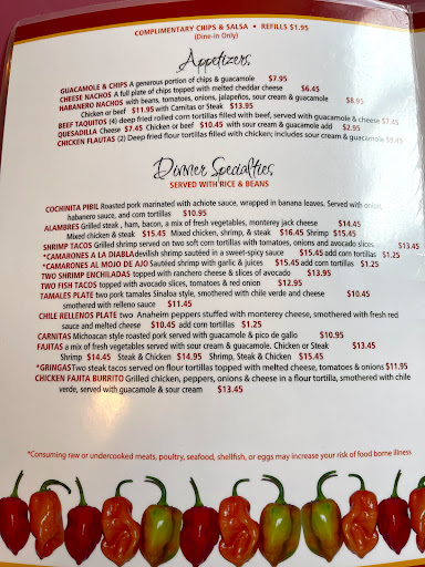 Food was fine. I got the El Habanero burrito (I think it was a burrito). I assumed that since they had dishes like El Habanero, El Jalapeno and El Serrano that they would be seasoned with said pepper. I was prepared for spicy, but their was NO spice all all. It tasted fine, but there was no zing. I was a little disappointed, but dont let that stop you from having a decent, but very mildly spiced meal.