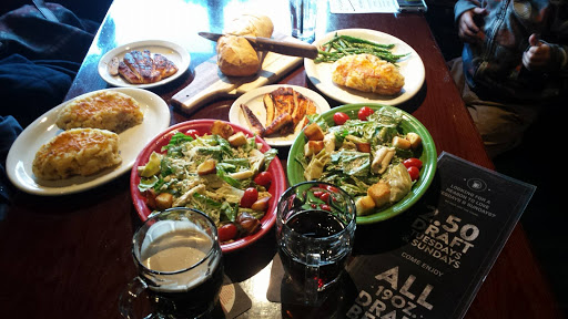 Concession: We had a large party (8), with 4 kids and I annoyingly eat vegan. A wednesday night. Short wait, not bad. Bread and butter was great. Their nitro stout was great too. Drinks came and we were missing a straw, so we requested one, it took forever to get one and had to ask multiple times. Kinda long wait on food, but not the worst. Food came, a kids pizza came as pepperoni instead of the ordered plain cheese. They took it back to make another. It apparently fell on floor after coming out of oven, so took twice as long to make. Everyone had food except 1 hungry child. Also, one person never got their bowl of soup until all the food came out and we had to ask for it again. Requested ketchup for chicken fingers, which again took forever to get, and was nearly empty when we got it, and chicken was cold by then. Had to steal another bottle from a neighboring unbussed table. My "steamed asparagus, no salt, no oil" came out glistening in oil, obviously sauteed. My veggie burger and another sandwich were missing the ordered mushrooms, onions and peppers (which are menu add-ons). Once I got them and assembled my V burger, it was delicious. Manager apologized and did reduce some cost of bill. Half of our party comes here weekly and never had issues like this. Maybe they were just having a bad night. To top off this mess, the sprinklers were on when we left between front door and parking lot, getting us wet.