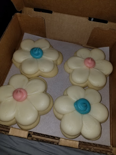 My insurance agent brought me a dozen daisy shaped sugar cookies with pink and white frosting from Smart Cookie. They were in a pizza type box. The presentation was great and they tasted yummy. Im giving a baby shower on Saturday and Im going to order a few dozen of the mini version.