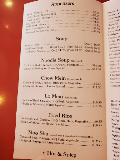 This place is absolutely fantastic. I have been here a lot and never had bad food. They have really good wantons and huge entrees for a very cheap price. Literally everything ranged from $8.99-$11.99 and you got enough food to feed two people with one entree. They have many different options to choose from and everything I have tried has been fantastic.