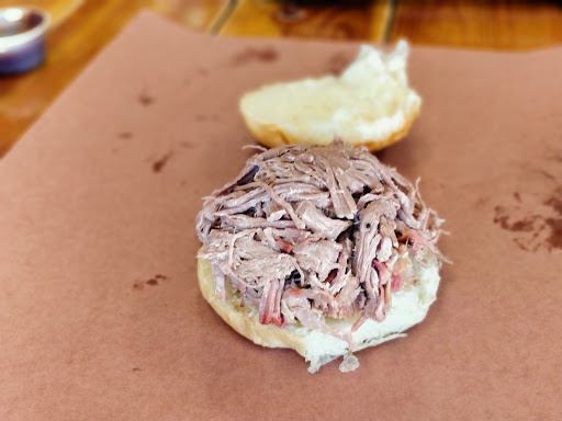 My husband and I were excited to try this local bbq place after hearing rave reviews from family and strangers alike. What a let down. We stood in line for 1/2 an hour only to find out the item we each wanted to order was all out. Quickly choosing something else we both tried something different. I got some ribs and my husband got the brisket sandwich. The meat was really tasty, but the server who put my husbands sandwich together mashed up the meat grossly with his hands and then slopped it on the bun. The bun was then so greasy because of the meat he could hardly eat it. My ribs were good, but with the price we were paying I didnt order a side and 4 ribs didnt fill me up at all. They should serve some sort of bread or biscuit with all orders. I know Im not very experienced with bbq places. Die hards might like it. I just thought the service and the quantity of the food did not match the price or our wait time. Really wish they would have made an announcement that the pulled pork sandwiches were out before we waited in line for half an hour...