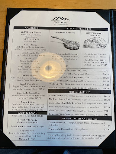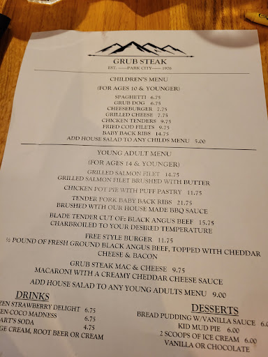 The name says it all. Grub steak provides a perfect blend of traditional, low maintenance food (the best salad bar in utah, fresh breads and soups) AND a sophisticated menu that offers a great mix of entres (local trout, 30 day aged meats, wild game plate with elk and an unforgettable exotic sausage). The place was flowing smoothly with over 70 tops seated in the still comfortable and private dining area. I enjoyed the authentic decor along with the local and historical elements. Wine list was great, with average prices (we had an 06 Cotes Du Rhone that was corked for $34.00), and filled up on beers from multiple local breweries. While its always nice to see a desert cart, it makes it difficult to hold back from the assortment of great desserts (try the bread pudding made with the vanilla bean bourbon sauce. its perfect). Our waiters name escapes me, but he passed his test. Wine presentation, attentiveness and knowledge of the menu was a needed reminder that we can still expect fine service.