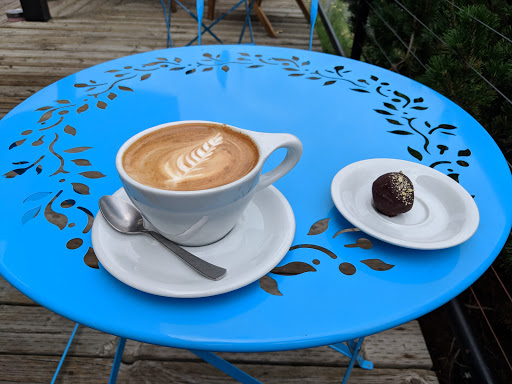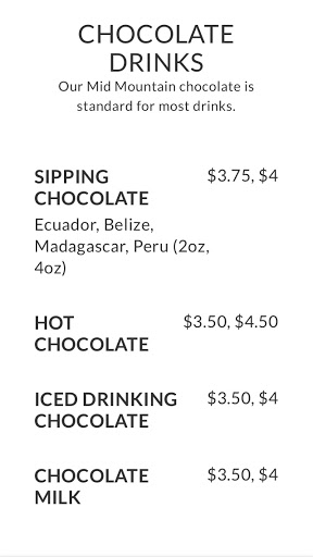 Artisan fine chocolate factory. Actually made from beans to bars on site. Serves sipping chocolate, hot chocolate, hand-pulled espresso, French press and pour over coffee. Hot cider and other fun drinks seasonally. Milk from local grass fed organic cows, almond, coconut, and soy milks too. Small fresh pastry selection including a gluten and vegan free option or two. Outdoor seating with dogs welcome on the patio. Free WiFi, and some power plugs inside. Plenty of parking. Nice lunch and dinner choices nearby sighs few art galleries to explore. A few hundred feet from the start of the historic rail trail.
