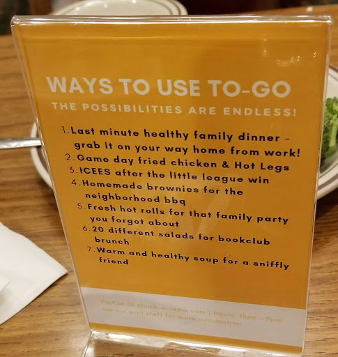 Classic home cooking comfort food buffet. The best thing about Chuck-A-Rama is their scones (fried dough) and honey butter. Their seafood night sounds exciting, but like all buffets, you should generally avoid it. Seafood just wasnt meant to be in a buffet. They have good fried chicken and mashed potatoes. Dont forget to tip your server.