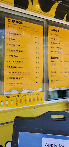 Cupbop is my favorite Korean food truck/restaurant in Utah! Lets start with the food, I would give it 6 stars if I could! My favorite is either the Hot Bop (spicy pork) or the Combo Bop, you cant go wrong with either. There is a various selection for vegetarians as well. I am infatuated with their secret sauces. The creamy mayo-Sriracha sauce along with their spicy sauce are crack for my stomach. I usually go with a spiciness level of 8, but if youre not a big fan of spice, I would recommend anywhere from a 1-5. Every time I come to Cupbop, the staffs are always so nice and enthusiastic. I especially love the workers in the food trucks, I look forward to hearing them yell out my order each time!