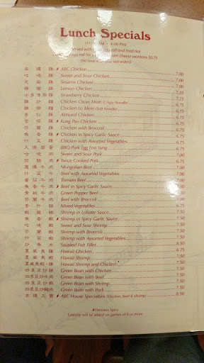 Everything youd expect and want from an American Chinese restaurant. Large amounts of food, good quality, good selection and great flavors. Other Chinese restaurants nearby have lowered their quality of food and its very noticeable. ABC on the other hand has kept it exactly how youd want it.