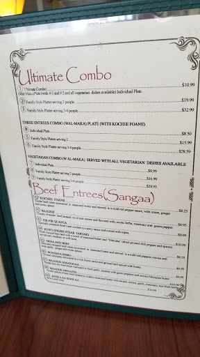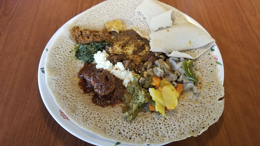 We ate the best Ethiopian food weve ever tasted at African Restaurant last night. Dont be fooled by the name; this is a table service restaurant, not a mini-mart with take-out. We had the combo dinner, with beef and vegetable dishes served on injera on a large platter. All of the dishes were delicious and the presentation was lovely. Both beef dishes were perfectly tender and exquisitely spiced. The vegetable dishes included several we had never seen before with beets, boiled eggs, and cheese, as well as the more common lentils, collard greens, cabbage and others. All were fantastic. The injera was tender with a wonderful sour-dough flavor. We will definitely eat here again as soon as possible.