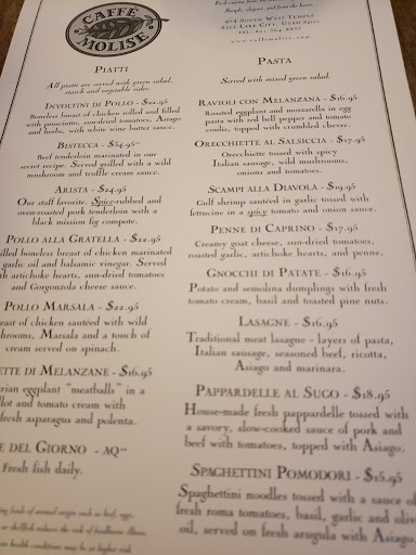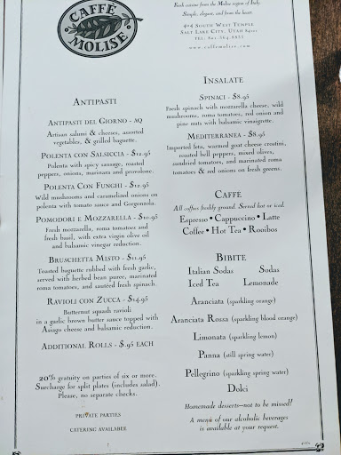 I have eaten at Caffe Molise several times, the location is convenient for those who are in downtown Salt Lake. The Antipasti Del Giorno appetizer was great, we shared it between 6 ladies during lunch. I am in love with their Gnocchi di Patate with grilled chicken. The pine nuts on the gnocchi is genius and the sauce is creamy and flavorful. My favorite! For dessert, we ordered one of everything :) I was most impressed with the Chocolate Hazelnut Mouse Cake and the Gelato and Sorbetto. The one that I had high expectations for and was disappointing with was the Creme Brulee. However, the outdoor seating is simply beautiful in the evening. A perfect place for a romantic dinner.