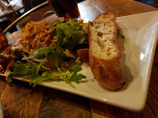 Cool decor. I like the wooden walls and lighting. Comfy booths and seating. The pizza my dining companions had was very good, including the gluten-free ones. However, the salad I had was horrible. Limp and soggy, with no flavor. Im not very fussy over food and usually finish everything, but I left most of this as it was so unappealing. I shared some of my husbands pizza instead. I would go back here, but next time Id order the pizza for sure! :)