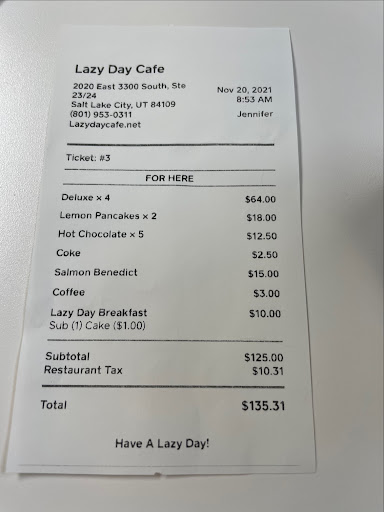 This place is a GEM! We came to SLC for Christmas week and were staying close by to this cafe. The four of us came for brunch on Christmas Eve and they were already closing but were sweet enough to make us food - how thoughtful, really. They deserve 5 stars just for that sweet Christmas gesture. We ordered fried chicken waffles and the lazy day cafe breakfast that came with eggs - sausage - hashbrowns and shared a plain waffle that came with homemade jam and syrup. Oh My God! That waffle is too good! They only serve it on weekends so make sure to stop by. We were so pleased that we came for a 2nd time just before leaving SLC. Between the four of us we tried their amazing homemade biscuits and gravy that came with eggs and hashbrowns; their omelette with fried chicken; their eggs Benedict which were YUM and we all shared their lemon pancakes. Now, whats best after their incredible waffles? You got it! The freaking lemon pancakes - SO GOOD! Place is clean and the staff is really friendly and amazing energy. Clean bathrooms. Might wait a bit to get a table if you dont mind the old school bar eating style. If I come back to Salt Lake City, Ill make sure to get my breakfast love from Lazy Day Cafe. Thumbs up to all the hardworking team in the kitchen and on the floor. Keep it up guys!