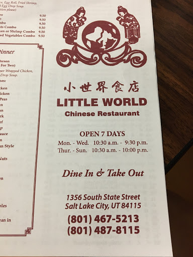 I am a food fanatic. I never write reviews, but the food at Little World is ridiculously good. Dont mind the atmosphere, because Little World is only concerned with the quality of the food. Im sure they know they have superior cuisines or theyd have to modernize the interior to adjust for sub-par chinese.The service is average, but to be honest they could be the Soup Nazi from Seinfeld provided they keep making the most addictive chow mein in all of Utah, which you should order Cantonese style. It has a China Town feel with a better than China Town taste. I just wish they posted a menu online. I live in West Jordan and whenever I feel like Chinese I have no problem making the trip downtown.