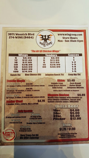 So Im in a foreign land, Millcreek and I need something to eat. I gave up little children because there are some laws against cannibalism, although Sweet Baby Rays Barbecue Sauce makes everything taste great (F.Y.I.). Now slightly to my left I spot this hidden place and some guy walks out with a box.Could it be this is free box day? I dont know but I have some relatives who "Flew the Coop", if you know what I mean...So naturally the name Wing Coop catches my eye; I slowly walk in not sure if this is some Illuminati Underground House of Worship.Eventually I am given the code name 4 Piece Special till 4 pm...they sense Im not a local. Soon I am forced to sample from a ritual spoon and some guy points to the "Sauce Maker" who just happens to be there.Coincidence? I dont know. Later I am asked by 3 members Aaron, Vince and Chang, "What did you think of the meal?" Not wanting to leave without "The Box", I quickly tell them I agree with the written tablet above them (The Menu). All I know is Im flying back to "The Coop" as often as I can. In the meantime, I pray they eventually open a ward in A.F. Sadly, I never got that box but they sent me off with 3 sacred garments, known only as Fingerbowl.