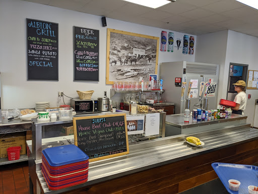 Albion Grill serves typical ski lodge cafeteria fair. Theres hot chocolate, coffee, chili, burgers, sandwiches, fries, a decent selection of beer, and variations on the above. The salads arent a total waste of time, but theyre not terribly tempting, either.