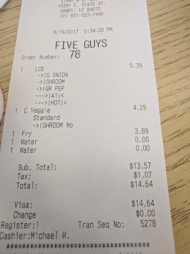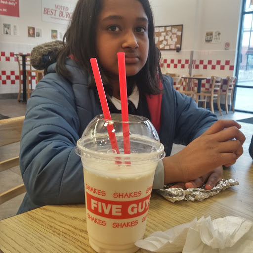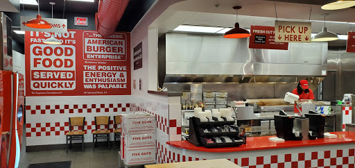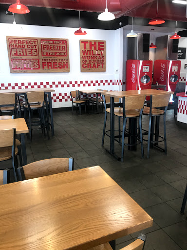 I love Five Guys. Their burgers are really good and the service is relatively quick and friendly. The restaurant is well-maintained and pretty clean. The only complaint I would have is the steep price.