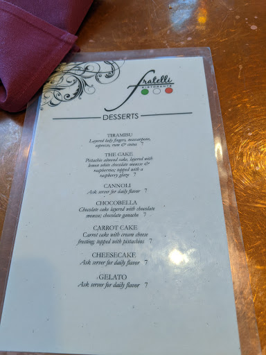 I generally dont leave reviews, but our experience was so contrary to the current high rating, I had to do something. To give some context, I ordered the Veal Marsala, and the tomato basil soup. My wife ordered the Chicken Parmesan, so I cannot speak to their pizzas or other dishes. I will say, however, that everything we ordered was vastly disappointing in one way or another. My meal started with the tomato basil soup. As with everything else in Fratellis, the presentation was top notch. While the soup looked nice, it tasted watery, acidic, and had no hint of basil. I am used to a smooth, almost velvety, tomato basil soup, so the raw acidity of the tomatoes was overwhelming. This tasted as through they had opened a jar or crushed red tomatoes, and warmed it up. The meal continued to the Veal Marsala, which again had very nice presentation. However, the carrot garnish was nearly raw. The veal was overcooked to the point of being chewy, tough, and unappetizing. Furthermore, both the mashed potatoes and veal were bland. The breading on the veal was under-seasoned, as were the cutlets themselves. As for my wifes dishes, she was equally disappointed. The chicken parmesan came in a HUGE dish. However, there were only two small pieces of chicken in the bowl. The chicken was at least seasoned, and not overcooked. The massive bowl of pasta was drenched in their marinara sauce. Like the tomato basil soup, the sauce was highly acidic, and lacked proper seasoning. In short, I would put the quality on the same level as the fast food Italian places that pop up in mall food-courts. The presentation was nice, as was our waiter, but not nice enough to save our experience.
