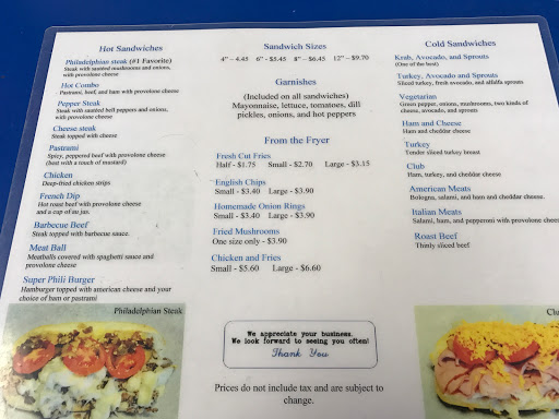 I dont know how theyve continued to pass the health deoartments requirements for the last 15+ yrs cuz when u look at the greasy carpets and small kitchen area lined with grease going up the walls it kinda might make the weak stomached sick, not to mention the 5ft grease trail leading outside onto the cement side walk, & I dont think theyve changed their grease in their fryers since theyve opened but maybe thats what makes it so good & thsts why I keep coming back, I might also recomend you callvin your take out order so you have limited exposure lol. Their sandwiches sre to die for, their massive their 12" is equal to about a 24" anywhere else with how much meat and ingrdients they will pile on for you. I usually get the 8" American meats and substitute the cheddar for provolone yhen just add a whole bunch of pickles thats ham bologna and salomi stacked high then alot of provolone pressed down in where it will fit usually barely any room at all, I usually have to take some mest off to givevto my dog and thats not a bad thing thats just do I can have somewhat of a chance to finish it at all which I stiil fall short of usually. I also always have to get an order of fries cuz for some reason no where else has the taste and I think its the lack of changing grease aswell as they are thicker cut so they should stay in longer to cook but since they dont the grease immedistely falls below 375f in temp & it leaves them with alittle grease on them, & just like the subs they dont skimp on yhrir fries either their large order is about 6" long container x 6" wide x 7" tall & even if u order tmtheir half order it comes in the same container just cost less but seams to have about the same amount of fries then their fry sauce is alittle morebon the mayonaise side thsn ketchup and gors slong perfect with their greasy fries and hesoing sub. When you get these items to go in a broen paper bag you can really tell where you got it cuz even though the fries are diuble wrapoed in wax paper you can see & feel the grease seapung out of the bag even the sandwich hss alittle grease. I highly recomend this place just if your more of a healthy eater then its a more if a once a month thing so it has time to settle or if ur weak stomached then make a call for a to go so you dont have to much exposure to the place. Philly cheese steaks are extremely close to the real thing here othrr than the liquid cheese theyve got the greasy part down aswell as the taste. Make this a destination stop on a weekend cuz you maybneed a nap afterwards. TOM