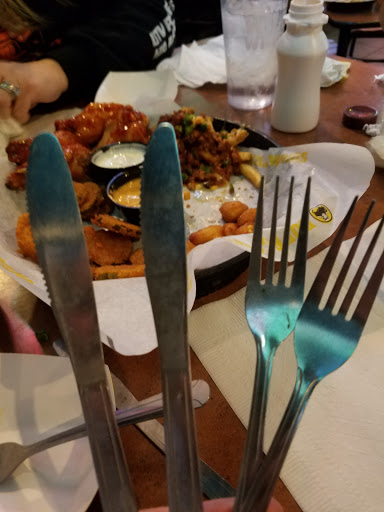 One of the very worst restaurant experiences I have ever had. Dont go to this location. 3 friends and I went here to watch a UFC fight. After waiting for an hour (initially understandable due to the crowd) we ordered some to-go meals and continued to sit on the bench and watch the fights. A waitress walked up, asked our names, and then looked at us surprised and said, "I called your name 45 minutes ago!" The buzzer they handed us when we first walked in NEVER went off and all four of us never heard them call our name. They sat us in the next available booth and then the waiter proceeded to tell us we needed to order something or else we would be asked to leave. "But we already ordered to-go because our buzzer never went off," we described (as we were still eating our dinners). She didnt buy it and we proceeded to be pestered by another waitress and then the manager. He insisted that we leave because we werent going to order anything else. Some crew...punishing us for their mistake. Go elsewhere, this place doesnt have a clue regarding customer service. Ill never go back.