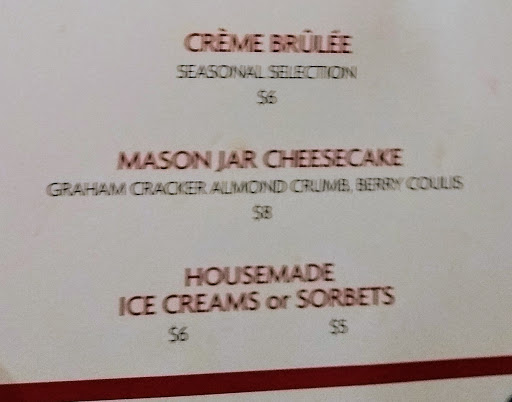 Food was excellent. Nice grill, good options, creativity and serving all exceeded expectations. Waiter was very weird, maybe he was new. Try the grilled asparagus and the mushroom risotto if youre vegetarian. Creme brule is a big serving, enough to share for two people.