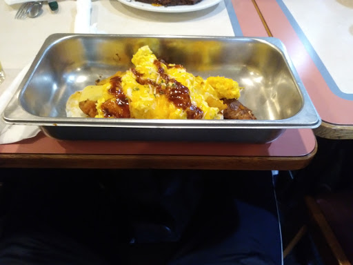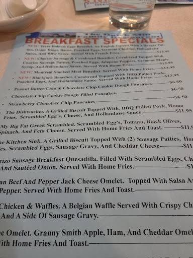 Its a small, somewhat outdated space, but the dining room was clean and comfortable and pretty full. The service was a bit slow to order, but the food came quickly and the server was friendly. I had the Kitchen Sink breakfast which consisted of a grilled biscuit topped with sausage patties, home fries, scrambled eggs, and sausage gravy. The food was nothing to write home about. The sausages were preformed patties, the biscuits were probably prepackaged, and the taste of pepper overpowered pretty much everything else. The dish came served in a small metal chafing dish, hence the name Kitchen Sink. I couldnt decide if this idea was cute and fun or kind of weird and embarrassing. The portion size was over the top, so I had lunch on the left overs. Id recommend this place for a quick, inexpensive breakfast or lunch.